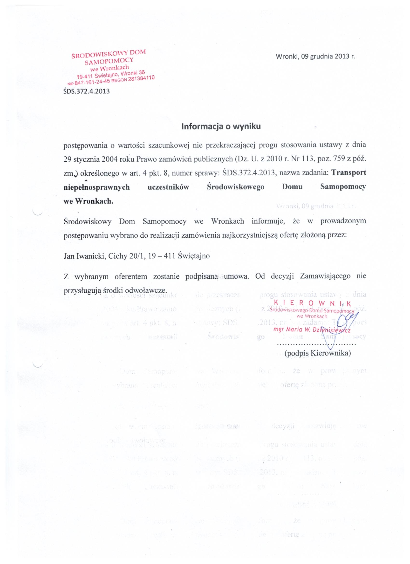 Środowiskowy Dom samopomocy we Wronkach informuje, że w prowadzonym postępowaniu wybrano do realizacji zamówienia najkorzystniejszą ofertę.