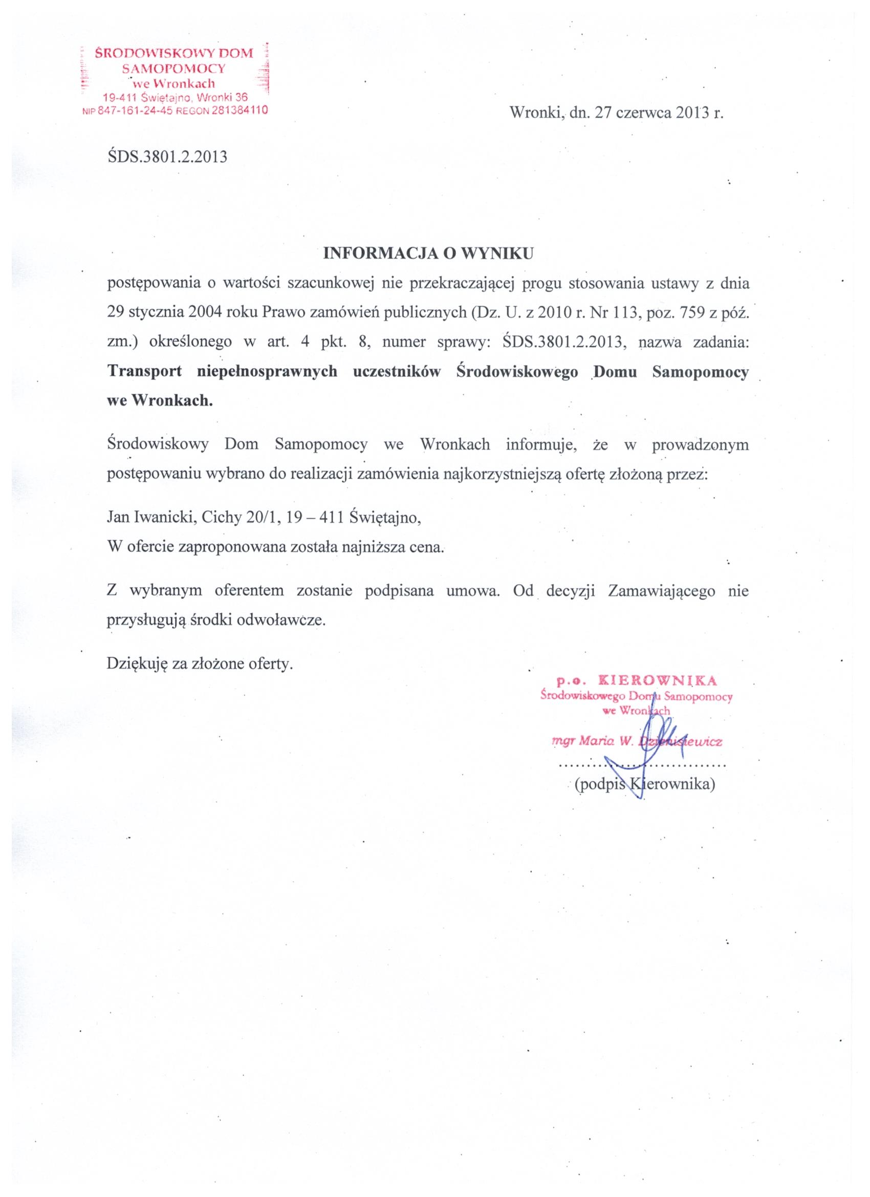 Środowiskowy Dom Samopomocy we Wronkach informuje, że w powadzonym postępowaniu wybrano do realizacji zamówienia najkorzystniejszą ofertę.
